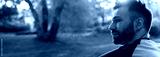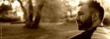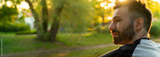 Panorama of middle-aged middle-aged Caucasian man with short beard sitting in park looking right with large copy space. High resolution, blurred background.
