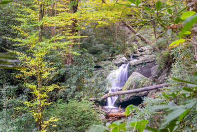Beautiful Waterfall and Stream in Autumn Forest of Great Smoky Mountains National Park - Tennessee, USA