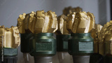 Brand new PDC Polycrystalline Diamond Compact drilling bit. Macro shot of drill bits on shelving in stock. Oil drilling equipment for drilling rig operation on oil platform in oil and gas industry.
