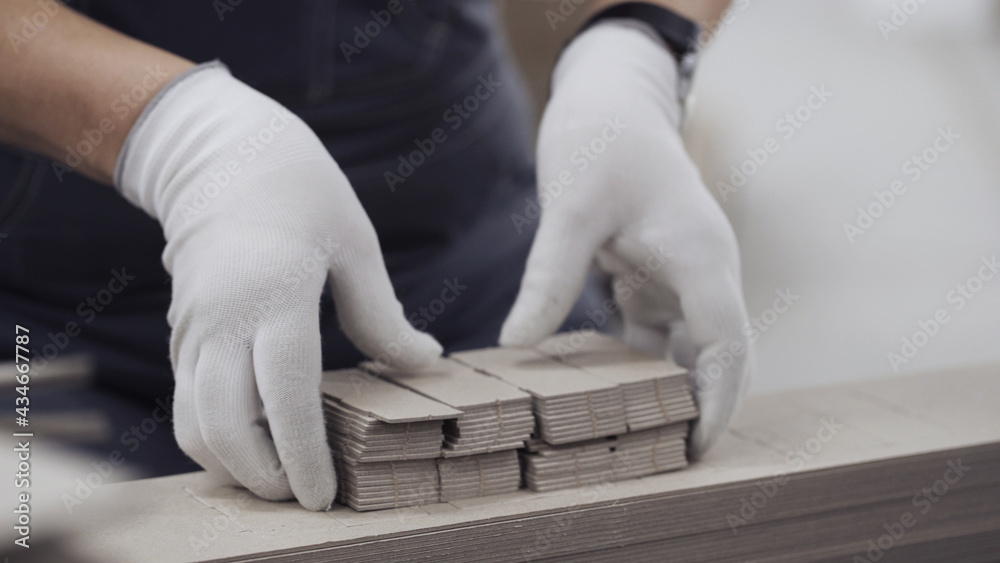 Close up worker hands with gloves squeezes elements out of cardboard mold. Modern factory of production cardboard box. Manufacture of cardboard boxes from paper. Enterprise for production package