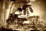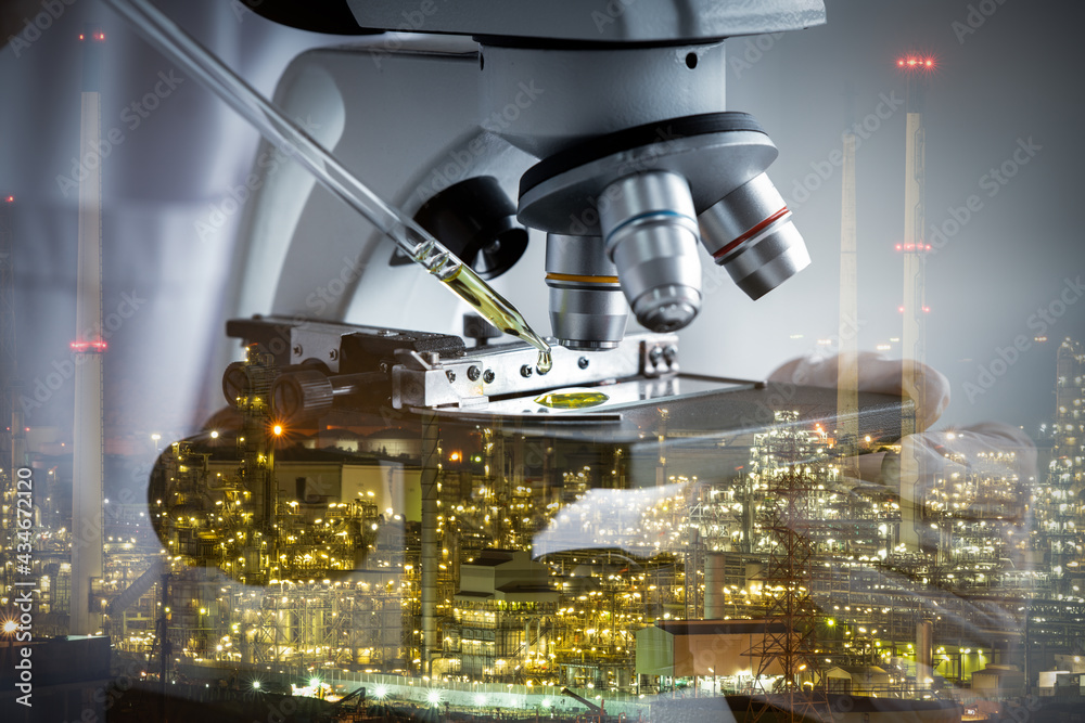 Double exposure scientist wearing uniform and glass holding test tube in laboratory research and development concept for industry with oil refinery background.