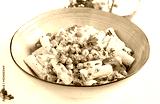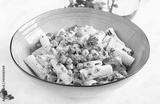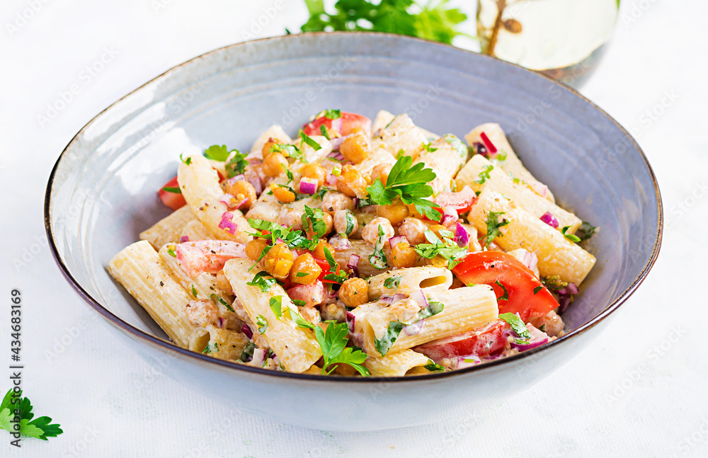 Vegetarian vegetable pasta. Pasta rigatoni with tomato, red onion, parsley and fried chickpeas with nut sauce. Vegan food.