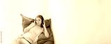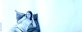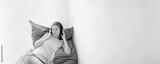 young woman relaxing on a bean bag pillow - female gen z with headphones listen to the music with closed eyes. banner with copy space with white background.