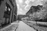 Różowe kwitnące drzewa na tle łódzkiej architektury z cegły.