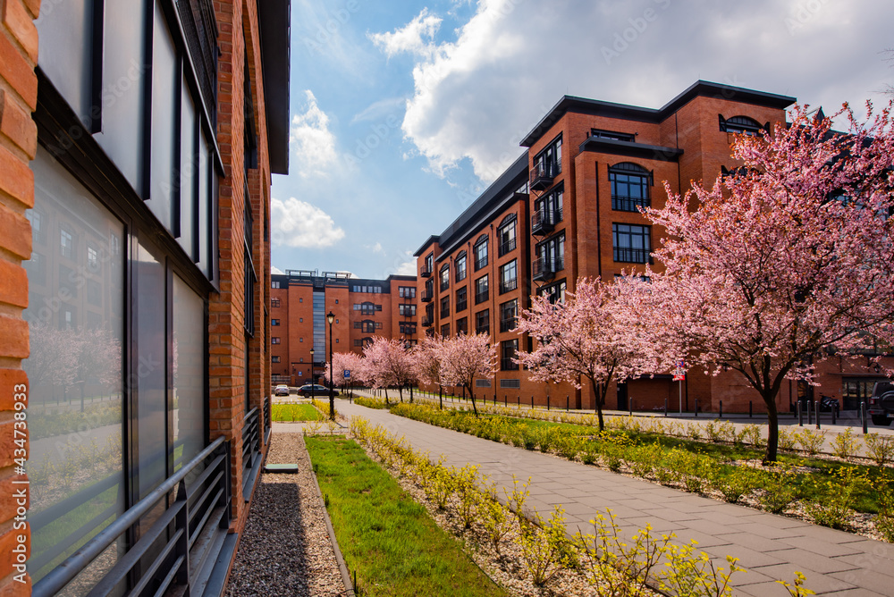 Różowe kwitnące drzewa na tle łódzkiej architektury z cegły.