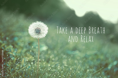 "Take a deep Breath and Relax" - inspiration motivation quote. fluffy dandelion on green natural background. atmosphere summer image.