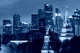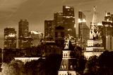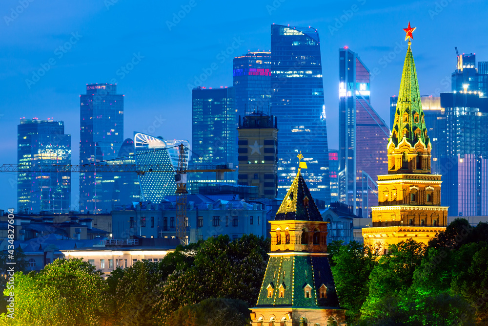 View of the Moscow Kremlin towers and Moscow City Skyscrapers during evening sunset blue hour