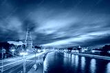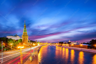 Moscow embankment view with Kremlin wall tower during summer sunset