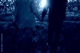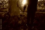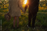 Couple holding hands in the blooming garden with warm sunset light. Romantic concept.