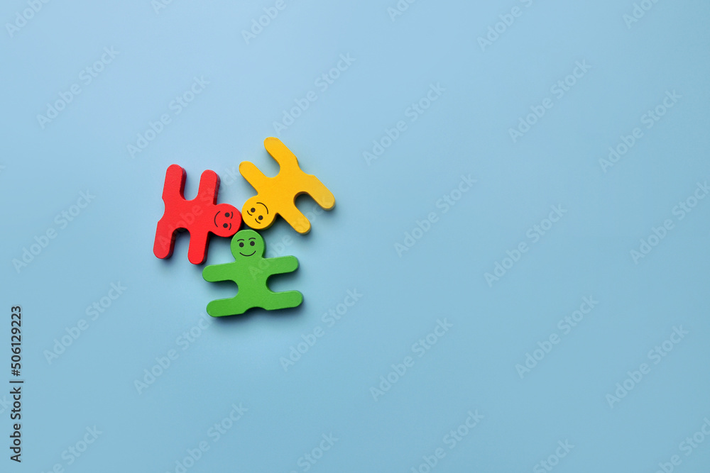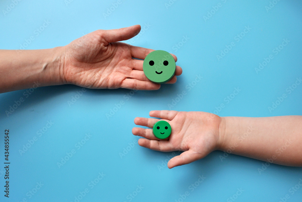 Mugs with a cheerful face in the hands of a child and an adult. Happy parents and happy child. Happy family