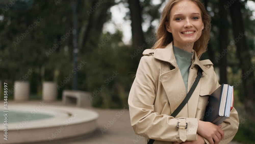 Student girl holding books looking happy smiling in camera outd
