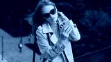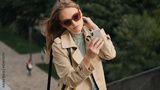Attractive girl dressed in trench coat wearing sunglasses taking