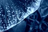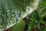 Heart shaped green leaves of Elephant Ear or Giant Taro damaged by unespected frost . Alocasia macrorrhizos. Tropical rainforest plant with illness.