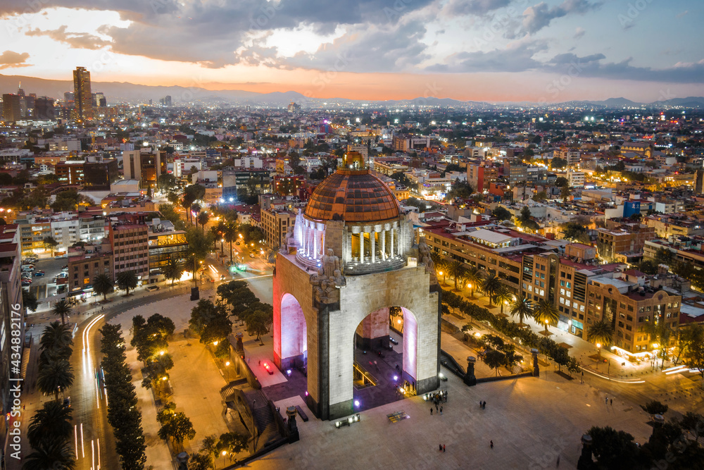 Aerial view of historical landmark Monument to the Revolution located at Plaza de La Republica at dusk in Mexico City, Mexico.