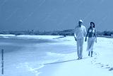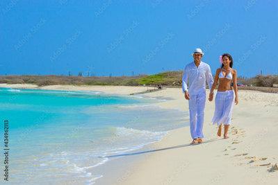 Couple walking on the beach, on the seashore, interracial, black, dressed in white outfits, fun couples on the beach