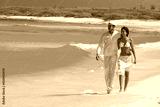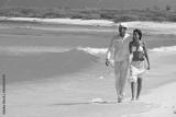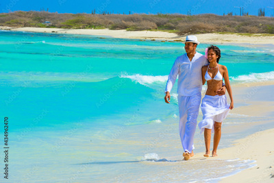 Couple on the beach, walking, smilling and hugging, interracial, black, dressed in white outfits, fun couples on the beach, young people