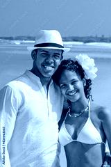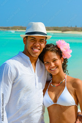 Couple on the beach, close-up smilling and hugging, interracial, black, dressed in white outfits, fun couples on the beach, young people