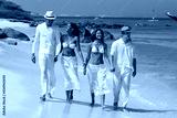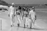Girls and guys at the beach, two couples, walking on the seashore, interracial, black, dressed in white outfits, fun couples on the beach, young people