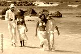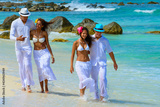 Girls and guys at the beach, two couples, walking on the seashore, interracial, black, dressed in white outfits, fun couples on the beach, young people