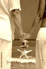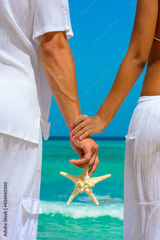 Couple on the beach, dressed in white outfits, holding starfish, looking towards horizon, torso view
