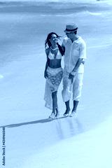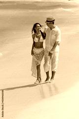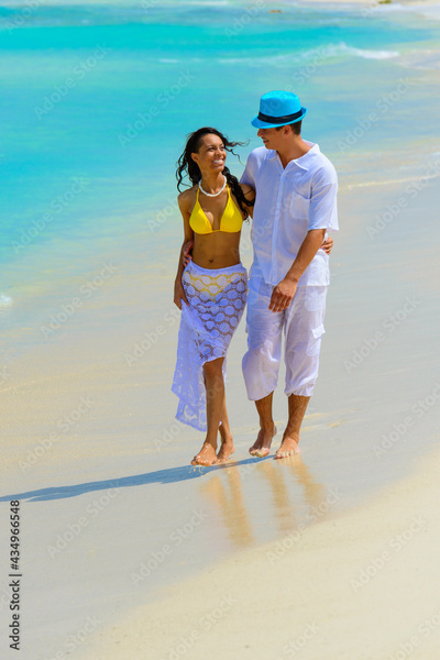 Couple walking, hugging on the beach, on the seashore, interracial, black, dressed in white outfits, fun couples on the beach, standing on the sand