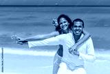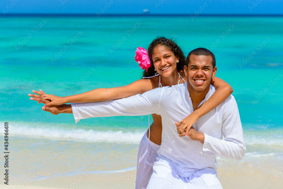 Couple at the beach, on the seashore, close-up, interracial, black, dressed in white outfits, fun couples on the beach, standing on the sand, woman playing with the man