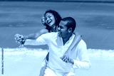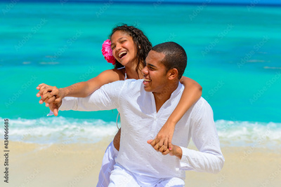Couple at the beach, on the seashore, close-up, interracial, black, dressed in white outfits, fun couples on the beach, standing on the sand, woman playing with the man