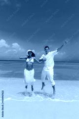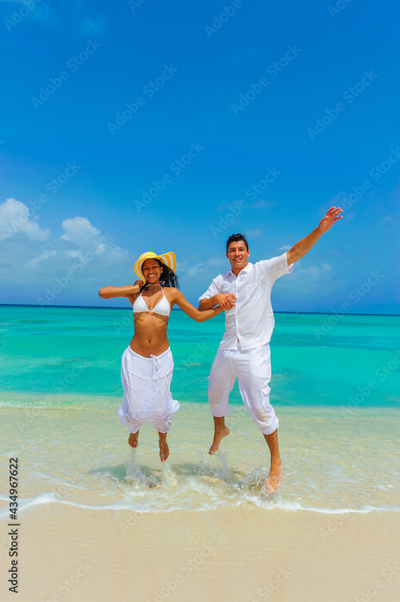 Girl and guy, couple at the beach, jumping on the seashore and waving, interracial, black, dressed in white outfits, fun couples on the beach