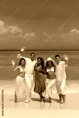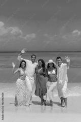 Girls and guys at the beach, standing on the seashore and waving, interracial, black, dressed in white outfits, fun couples on the beach