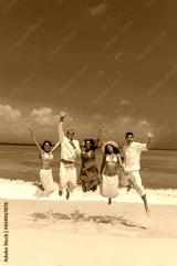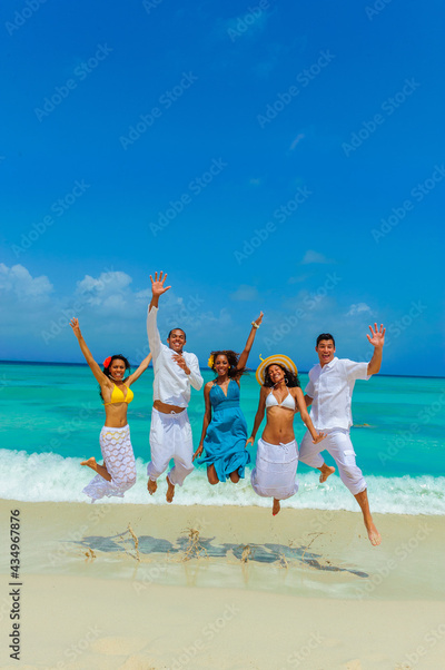 Girls and guys at the beach, jumping and waving, on the seashore, interracial, black, dressed in white outfits, fun couples on the beach