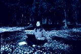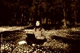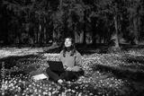 Woman with a laptop in the park. Young female sitting in grass with flowers work remotely in nature. Work everywhere travel blogger outdoors. Businesswoman sitting in forest Remote working concept