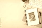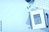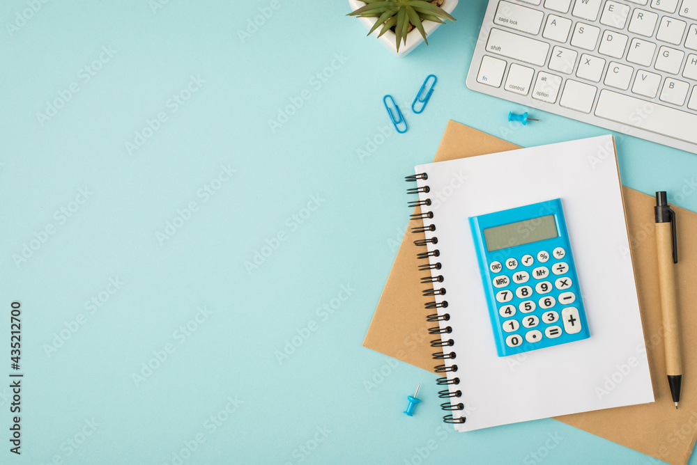 Top view photo of blue calculator on copybooks pen pins clips plant and keyboard on isolated pastel blue background with copyspace
