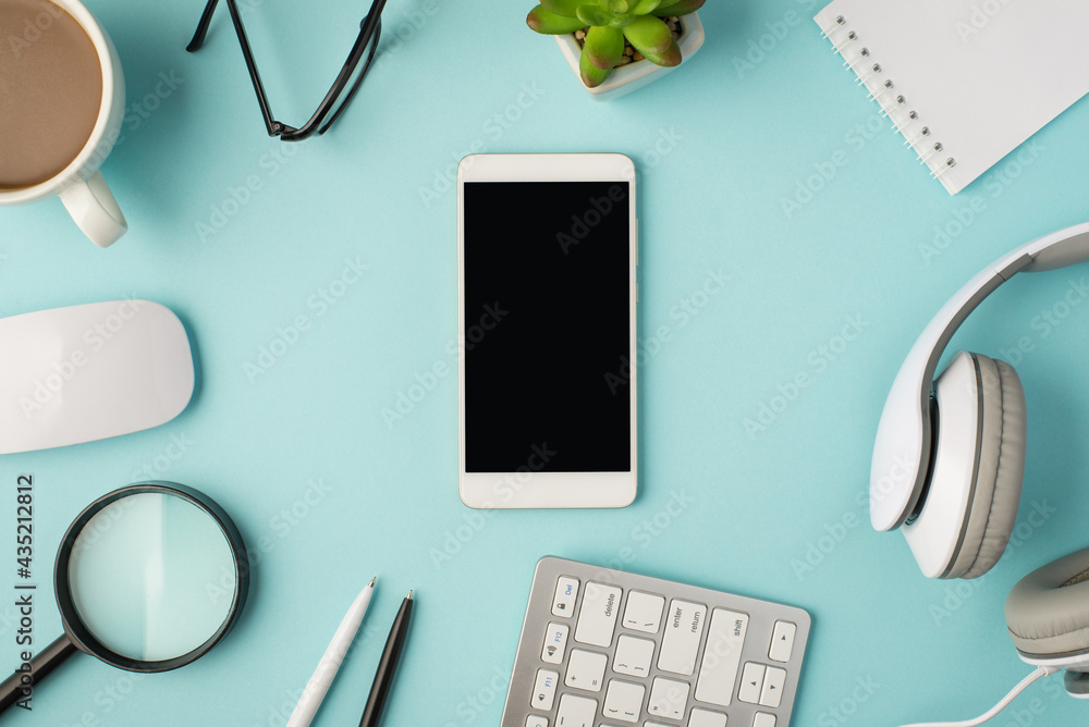 Top view photo of smartphone in the middle cup mouse pens magnifier keyboard headphones notepad plant and glasses on isolated pastel blue background