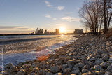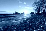 Full moon rising above a tall stone lighthouse - shallow depth of field shot through a blurry wooden beach fence. Fire Island, Long Island New York
