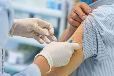 COVID-19 Vaccination concept. Doctor in rubber gloves injecting syringe with vaccine. Close up with selective focus