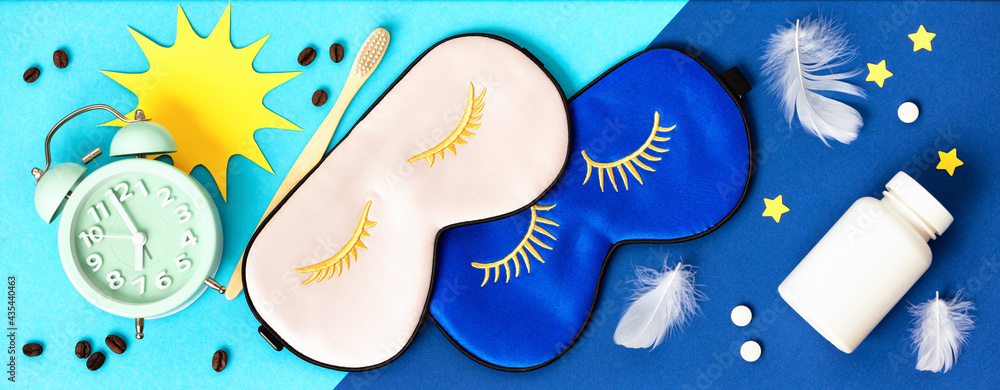 Concept of rest, quality of sleep, good night, insomnia, relaxation, mental health. Sleeping masks, pills, alarm clock, paper sun and stars on colorful backgrounds
