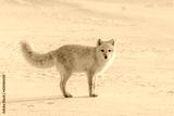 Happy arctic fox in winter tundra. Funny arctic fox.
