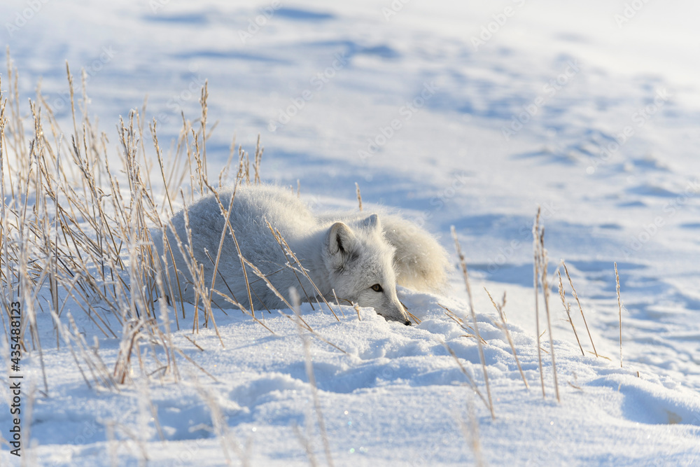 Arctic fox (Vulpes Lagopus) in wilde tundra. Arctic fox lying. Sleeping in tundra.