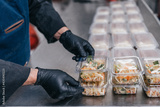 Food in disposable dishes ready for delivery. The chef prepares food in the restaurant and packs it in disposable lunch boxes.