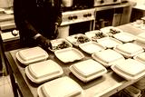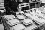 Food in disposable dishes ready for delivery. The chef prepares food in the restaurant and packs it in disposable lunch boxes.