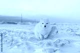Arctic fox (Vulpes Lagopus) in winter time in Siberian tundra with industrial background.
