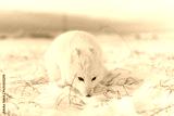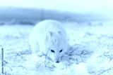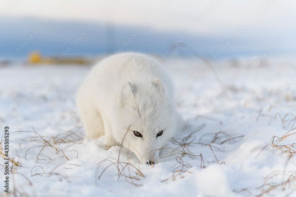 Arctic fox (Vulpes Lagopus) in winter time in Siberian tundra with industrial background.