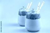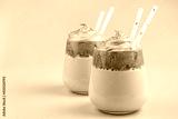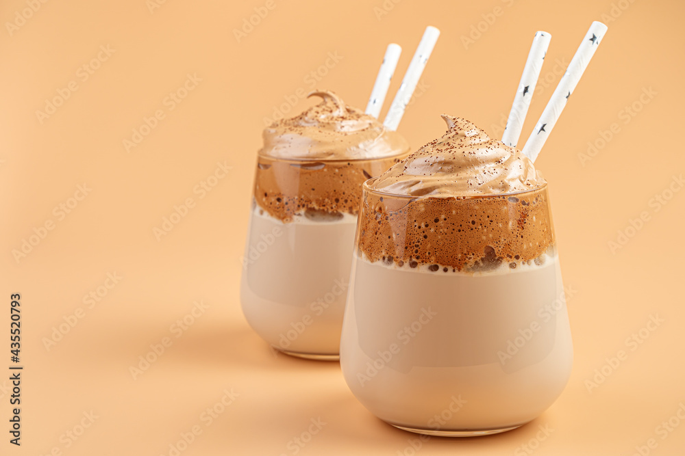 Dalgona coffee close-up in two clear glasses with straws on an orange background.