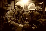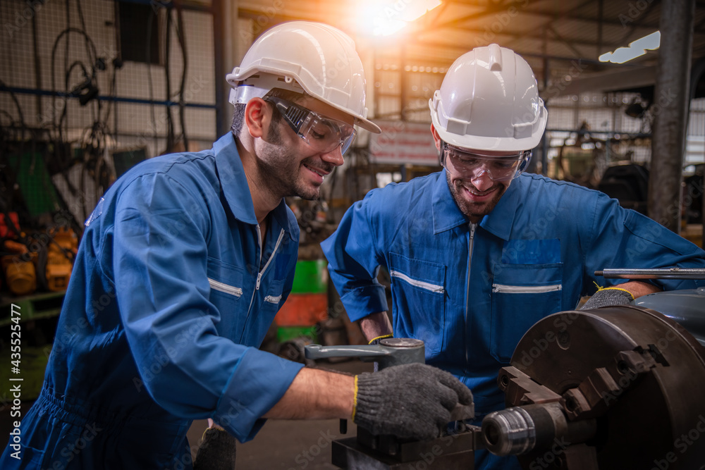 The Industry engineering wearing safety uniform control operating lathe grinding machine working in industry factory.