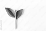 Wooden bamboo dental brush with two green leaves looks like a flower on a white background. Minimalistic composition. Eco-friendly toothbrush, zero waste, copy space, top view.