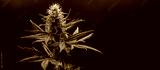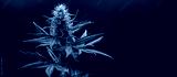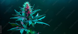 Cannabis fowering plant on dark green background. Long horizontal banner with marijuana hemp in colored light with purple hue. Coseup photo with cannabis bud in modern style with empty place for text