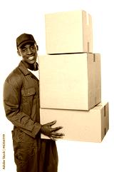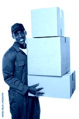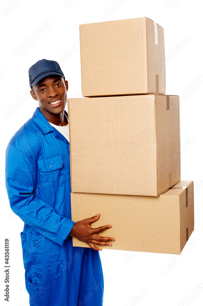 Young delivery guy holding stack of parcel boxes