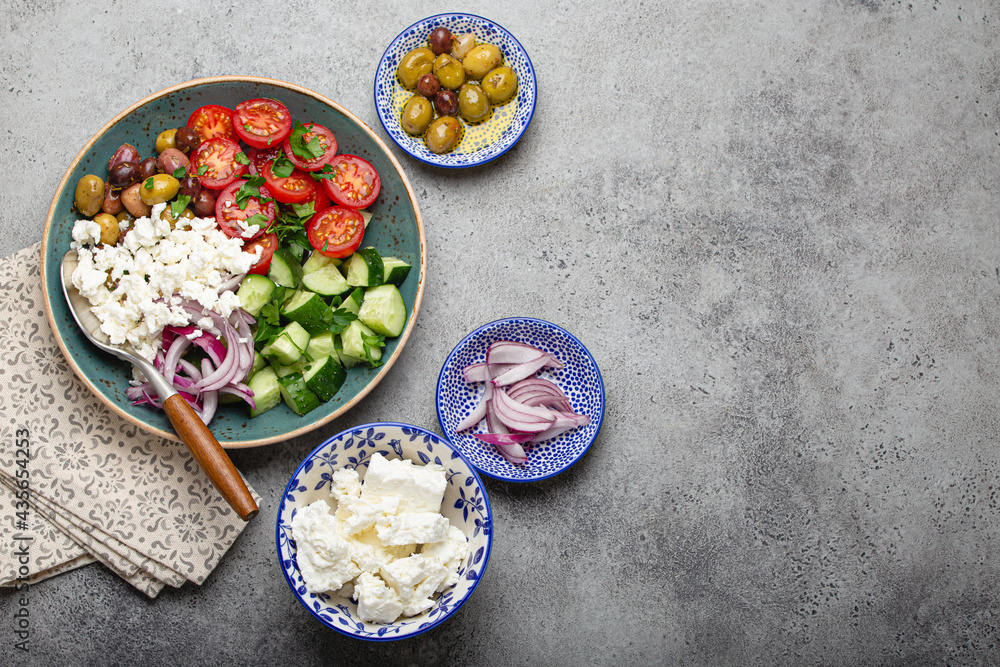 Greek mediterranean salad with tomatoes, feta cheese, cucumber, whole olives and red onion in blue ceramic plate on gray concrete background from above, traditional appetizer of Greece with copy space