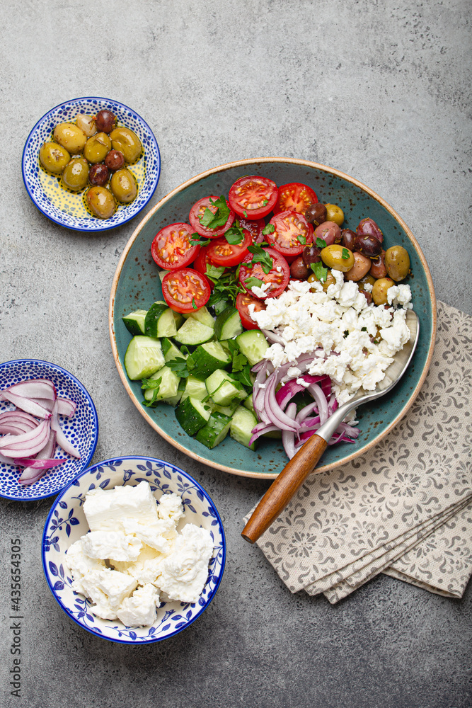 Greek mediterranean salad with tomatoes, feta cheese, cucumber, whole olives and red onion in blue ceramic plate on gray concrete background from above, traditional appetizer of Greece