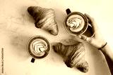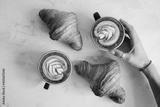 Two cups of coffee and croissant on white table